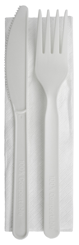 Einweg Besteck-Set aus CPLA, weiss, 3-teilig, Gabel, Messer, Serviette